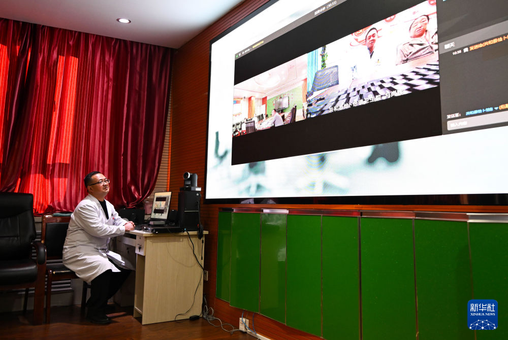 12月17日,在青海省海南藏族自治州共和縣中醫(yī)院,醫(yī)生穆連財在與鄉(xiāng)鎮(zhèn)衛(wèi)生院連線進(jìn)行遠(yuǎn)程會診。新華社記者 張龍 攝