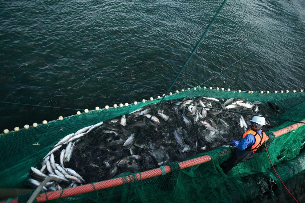 由于冷水魚對水質要求高,公司還自主研發(fā)糞便收集器、水下清污器等環(huán)保設備?!氨3炙|就保證了魚肉品質?!饼堁笾r技術部部長馬小軍說。