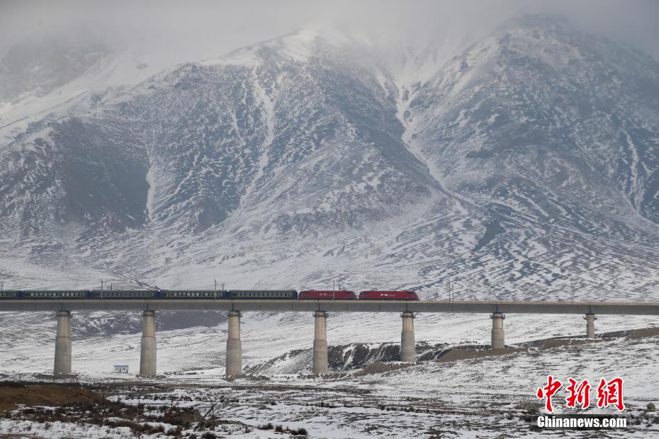 2月22日,鐵路列車從祁連山下行駛。一場春雪過后,青海省海北藏族自治州門源縣境內(nèi),連綿不絕的祁連山脈被白雪覆蓋,大地銀裝素裹,靜謐純凈,盡顯壯美山川。中新社記者 馬銘言 攝