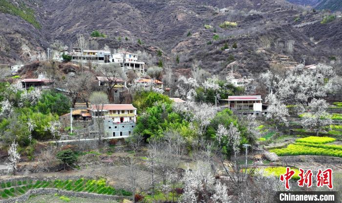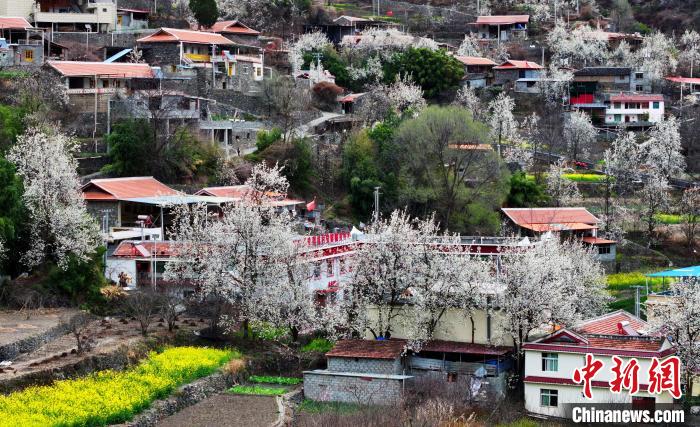 圖為梨花叢中的村寨。中新社記者 安源 攝