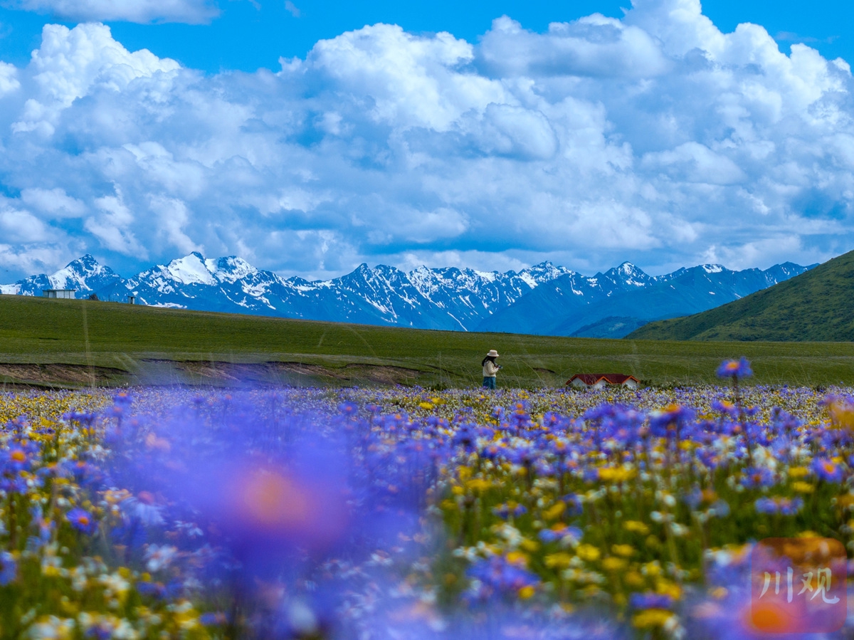6月25日,游人在花海間遠(yuǎn)眺草原、雪山美景。陳先林 攝