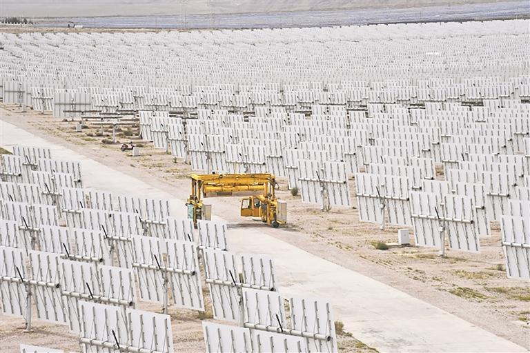 戈壁灘上,銀光閃爍。在青海省海西蒙古族藏族自治州德令哈光熱發(fā)電基地里,高聳的吸熱塔如巨人般矗立,27135面巨大定日鏡精準追光,將熾熱陽光匯聚塔頂。此時,儲熱系統(tǒng)的熔鹽溫度已達驚人的533.1攝氏度,有條不紊地進行著清潔能源轉化。
