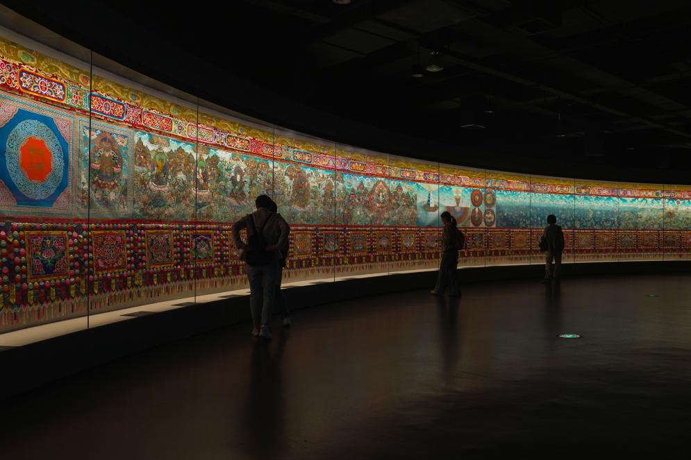 沿著展廳緩緩前行,最令人震撼的莫過于《中國藏族文化藝術(shù)彩繪大觀》。講解員溫得兄停在一幅描繪神話傳說的畫面前介紹:“這幅作品由青、藏、甘、川、滇五省區(qū)400位唐卡畫師共同完成,僅上卷創(chuàng)作就歷時27年。”今年4月,全長410米的彩繪大觀下卷布展完成,目前正在博物館北館特展展出。