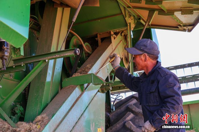 圖為農(nóng)民清理收割機內(nèi)的麥稈和雜草。中新社記者 薛蒂 攝