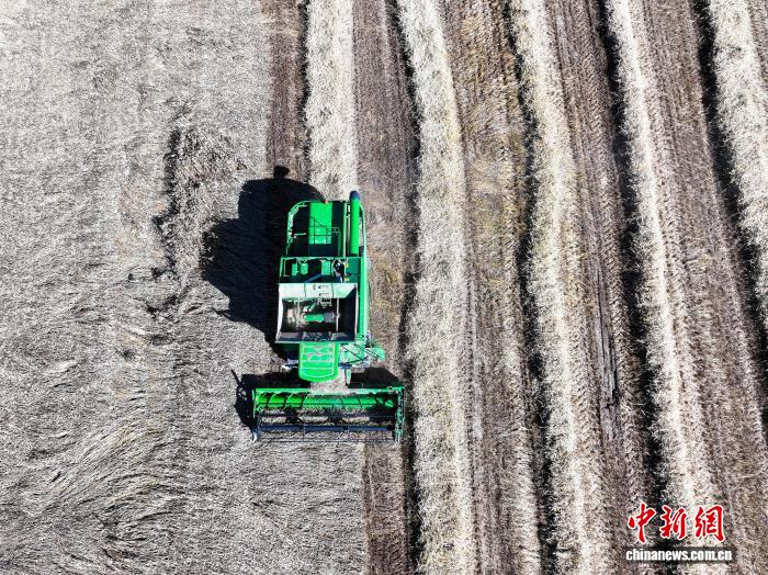 圖為小麥收割現(xiàn)場。(無人機照片)中新社記者 薛蒂 攝