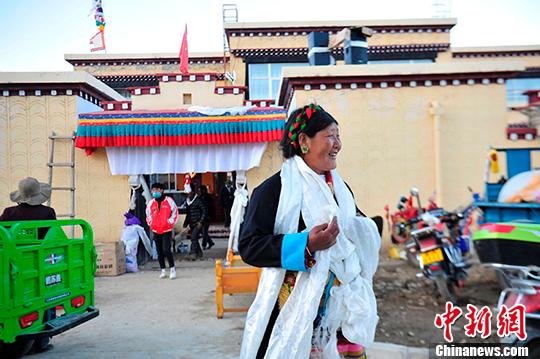 2月21日,村民那日在新居門(mén)前迎接賓客。那日的新家坐落在西藏拉薩市達(dá)孜區(qū)德慶鎮(zhèn)的幸福新村,這是西藏精準(zhǔn)扶貧易地搬遷安置點(diǎn)之一。中新社記者 王立林 攝
