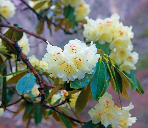 小葉杜鵑則要小一些,其高度不足一米,基本上與人腰齊高。在勒布溝內(nèi),小葉杜鵑主要分布在百花灘附近,也是顏色最為豐富的杜鵑花品種。高山杜鵑則分布在海拔4000米以上,相較于前兩個品種,其姿態(tài)要小得多,如同灌木叢。