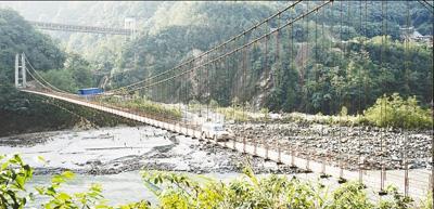 1994年,險(xiǎn)峻的雅魯藏布江峽谷建起了魯古吊橋,德興鄉(xiāng)與墨脫縣城從此可通車。圖為4月4日,一輛汽車小心翼翼地從魯古吊橋上通過(guò)。鄧建勝攝