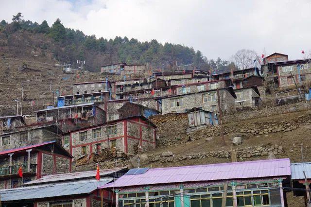 陳塘鎮(zhèn)錯落有致的夏爾巴民居,家家屋頂紅旗招展
