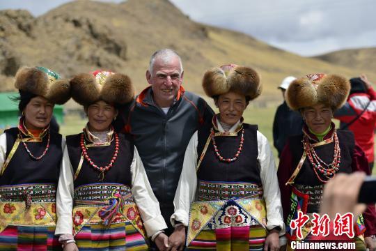 圖為外國越野跑愛好者在西藏山南與當?shù)夭刈迕癖姾嫌啊?周文元 攝