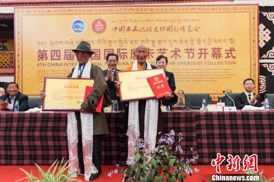 開幕式上西藏文化發(fā)展促進會授予國家級非物質(zhì)文化遺產(chǎn)唐卡藝術代表性傳承人丹巴繞旦、嘎瑪?shù)吕?位唐卡藝術大師“終身成就獎”。 何蓬磊 攝