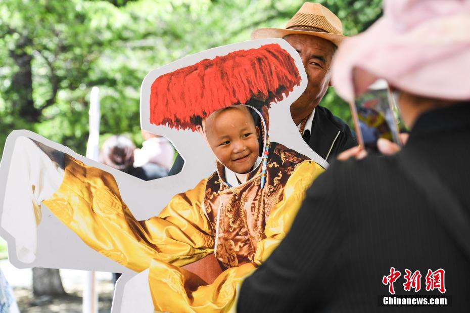 5月25日,2019年“藏戲演出季”第二場(chǎng)演出在西藏拉薩布達(dá)拉宮腳下的宗角祿康公園開(kāi)演。據(jù)了解,2019年藏戲演出季將持續(xù)到今年的7月20日,每周六來(lái)自拉薩八縣區(qū)的優(yōu)秀藏戲隊(duì)將相繼進(jìn)行公益表演。圖為當(dāng)?shù)貎和w驗(yàn)藏戲人物裝扮造型。中新社記者 何蓬磊 攝