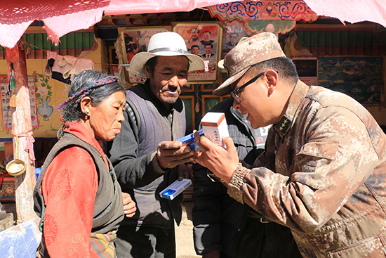車子剛停穩(wěn),聞?dòng)嵍鴣?lái)的村民們就排起了長(zhǎng)隊(duì)。索朗貢布頂著炎炎烈日穿梭在人群中耐心進(jìn)行翻譯,哪位老人該測(cè)量血壓,哪位患者該領(lǐng)取藥品了然于胸,兩個(gè)小時(shí)過(guò)去了都顧不上喝一口水。該部隊(duì)衛(wèi)生員應(yīng)曉晶介紹說(shuō),每次義診他們天不亮就起床準(zhǔn)備,天黑才匆匆返營(yíng),中途餓了就啃幾口干糧,然而只要索朗貢布工作抽得開(kāi)身,就一定隨隊(duì)前往,確保每次義診更加順利圓滿。