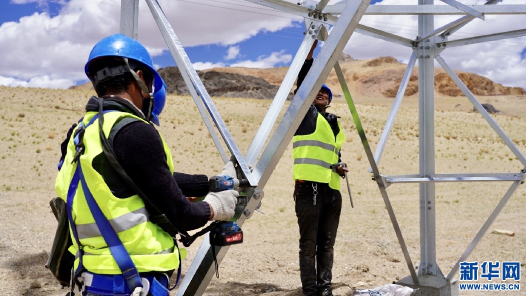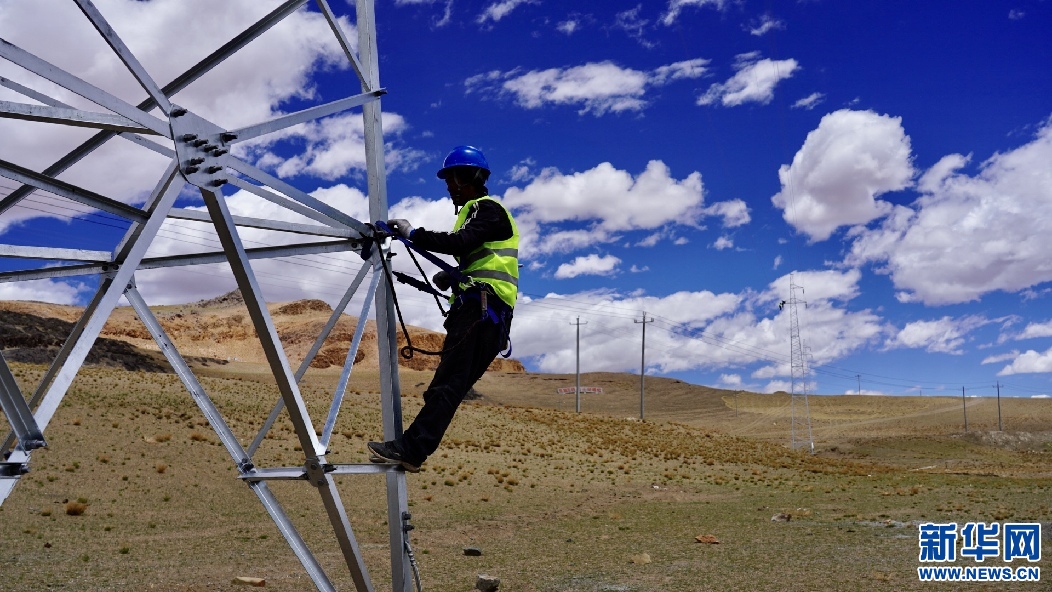 6月25日,西藏措勤縣磁石鄉(xiāng)35千伏輸變電工程現(xiàn)場,電力建設者正在進行輸電線路隱患排查。新華網(wǎng) 達珍 攝
