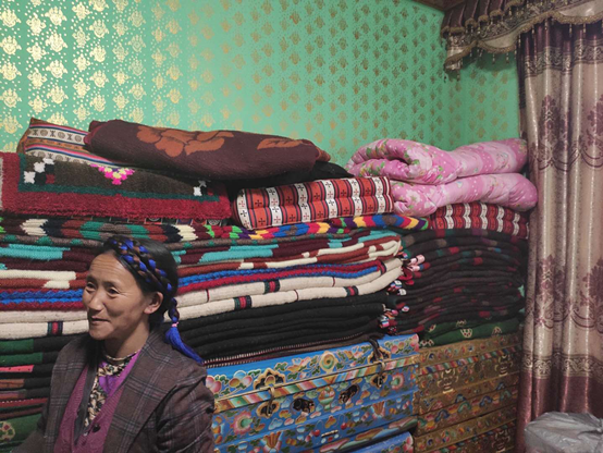 如今,卓瑪家有三層樓,除了自家居住,二樓、三樓提供住宿,一共8間房,可以住16位客人。一樓代賣當(dāng)?shù)氐奶厣a(chǎn)品,柜臺(tái)里,門巴木碗、糌粑、蕎麥酒等擺放整齊。照應(yīng)客人的閑暇,卓瑪還會(huì)做一些毛線手工編織售賣。算下來(lái),一年的收入有10萬(wàn)多元。