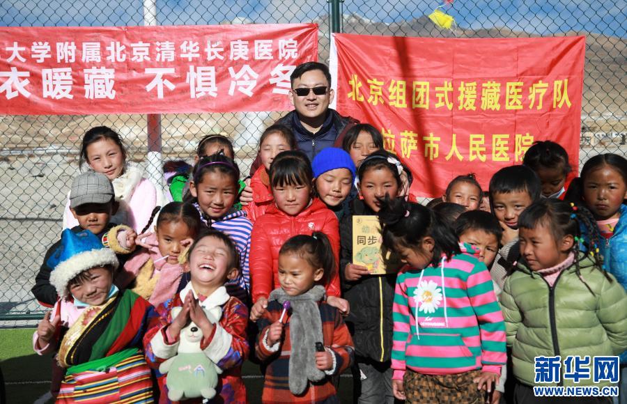 北京援藏醫(yī)生王學(xué)棟(現(xiàn)任拉薩市人民醫(yī)院普外科主任)在給孩子們穿上冬裝。(新華社發(fā) 肖海軍 12月3日攝)