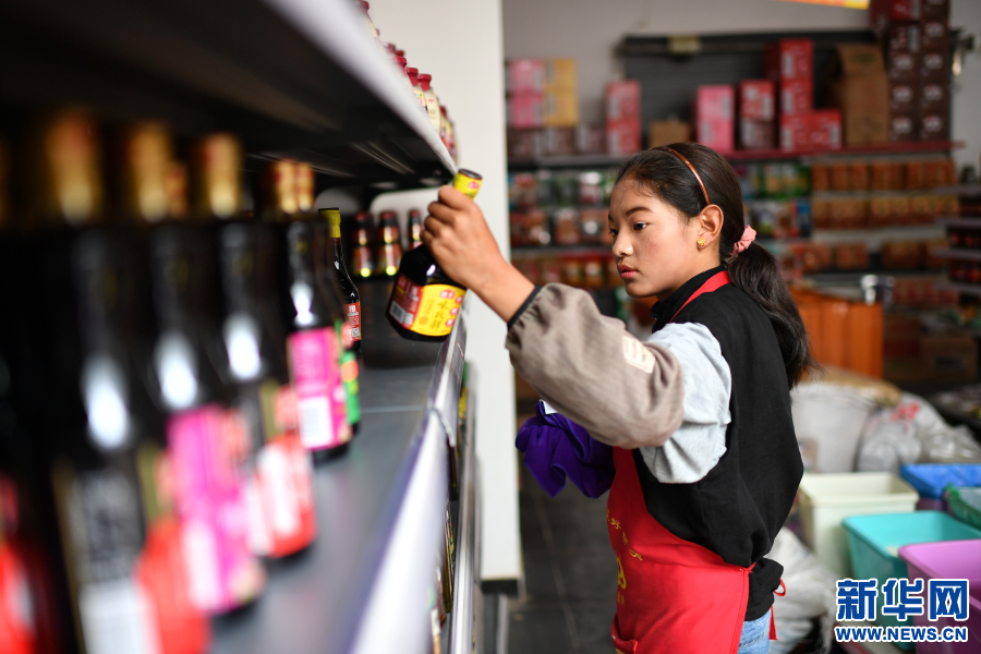 西藏昌都市丁青縣尺牘鎮(zhèn)烏巴村村民斯朗德吉在尺牘鎮(zhèn)的一家超市里打工(9月18日攝)。2018年,斯朗德吉和家人從烏巴村搬遷到尺牘鎮(zhèn)易地扶貧搬遷安置點(diǎn),住進(jìn)了寬敞明亮的新房子。斯朗德吉還就近在安置點(diǎn)附近的超市找到了工作,每個(gè)月有2000元的收入。新華社記者詹彥 攝