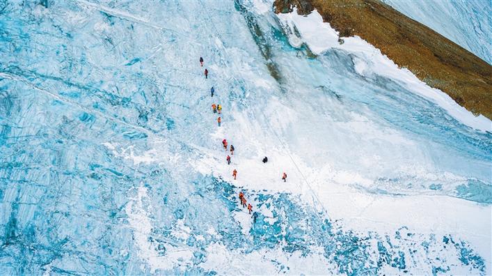 圖為當(dāng)雄縣格達(dá)鄉(xiāng)境內(nèi)的廓瓊崗日冰川公園內(nèi),游客與冰川近距離接觸,體驗攀登的樂趣。