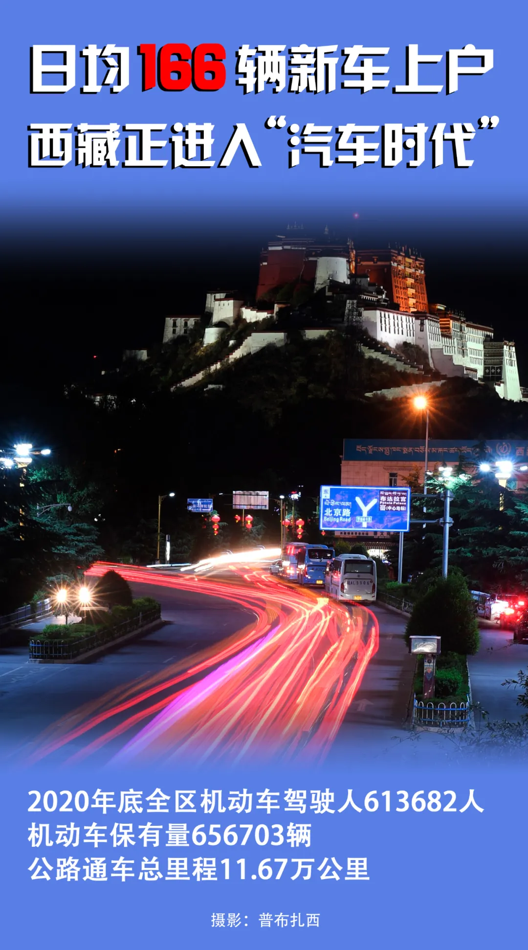2020年,日均新車上戶166輛;截至當(dāng)年底,西藏機(jī)動(dòng)車保有量達(dá)到656703輛,機(jī)動(dòng)車駕駛?cè)诉_(dá)613682人。西藏公路通車總里程達(dá)到11.67萬(wàn)公里。按照目前拉薩戶籍人口55萬(wàn)人計(jì)算,基本上平均每?jī)蓚€(gè)人就擁有一輛車。