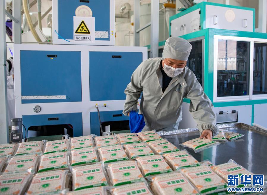 西藏拉薩達(dá)孜工業(yè)園區(qū)一家青稞食品生產(chǎn)企業(yè)的工作人員在擺放加工好的青稞產(chǎn)品(2020年2月17日攝)。新華社記者 孫非 攝