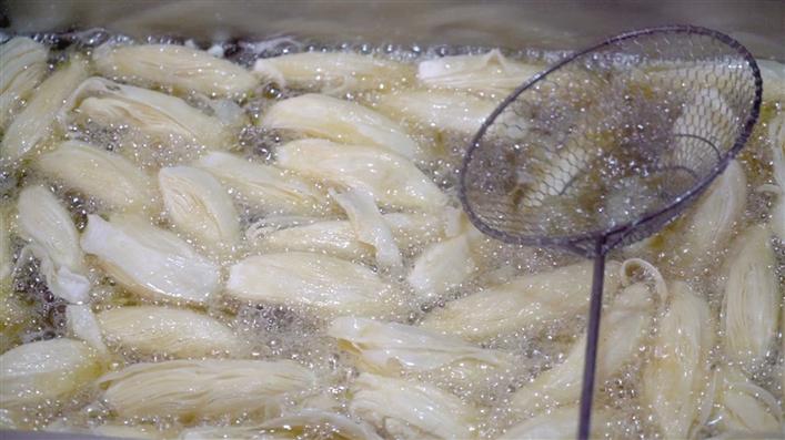 揉面、切割、染色,面片經(jīng)店員們巧手捏成條形、圓形、蝴蝶形等不同樣式,最后放到鍋里炸至金黃;出鍋時,再瀝上油、撒上白糖,香甜可口、樣式精美的卡塞就制作完成了。