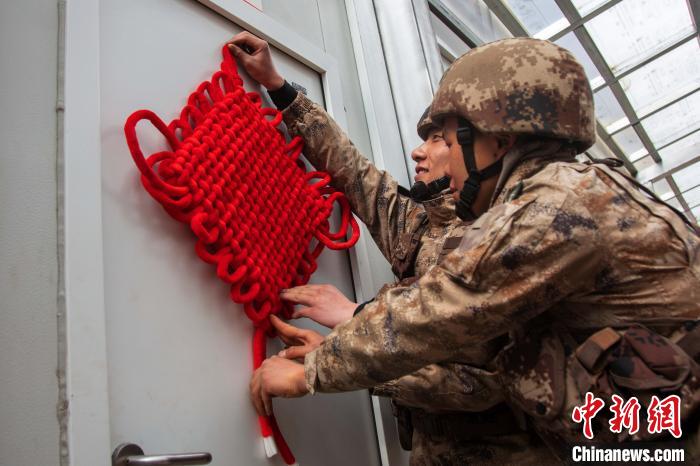 該旅官兵正在用中國結(jié)點(diǎn)綴裝飾保溫方艙。 王述東 攝