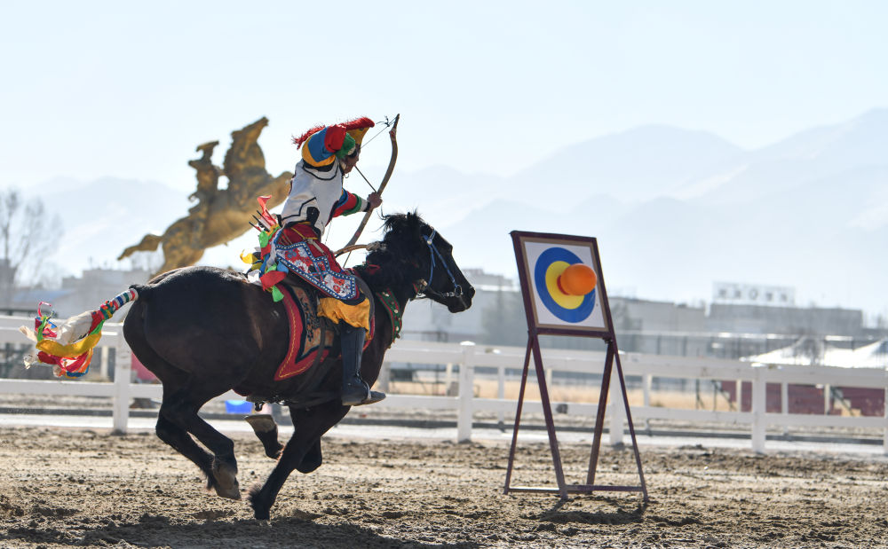 一名騎手在進(jìn)行馬術(shù)射箭表演。新華社記者晉美多吉攝