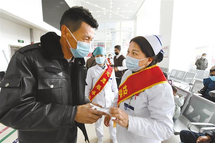圖為拉薩市人民醫(yī)院醫(yī)護人員為前來就診的患者服務(wù)