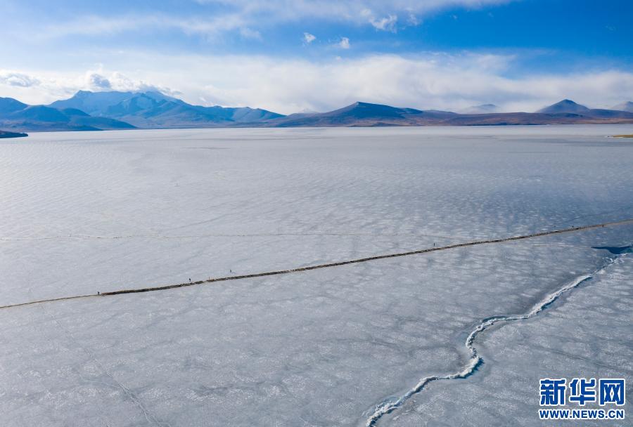 羊群順著安全小路通過普莫雍錯冰湖(3月6日攝,無人機照片)。新華社記者 晉美多吉 攝