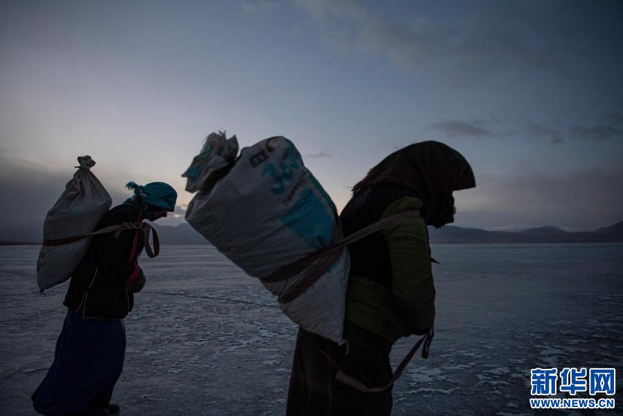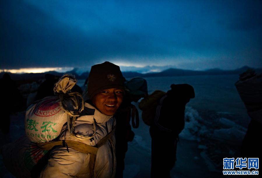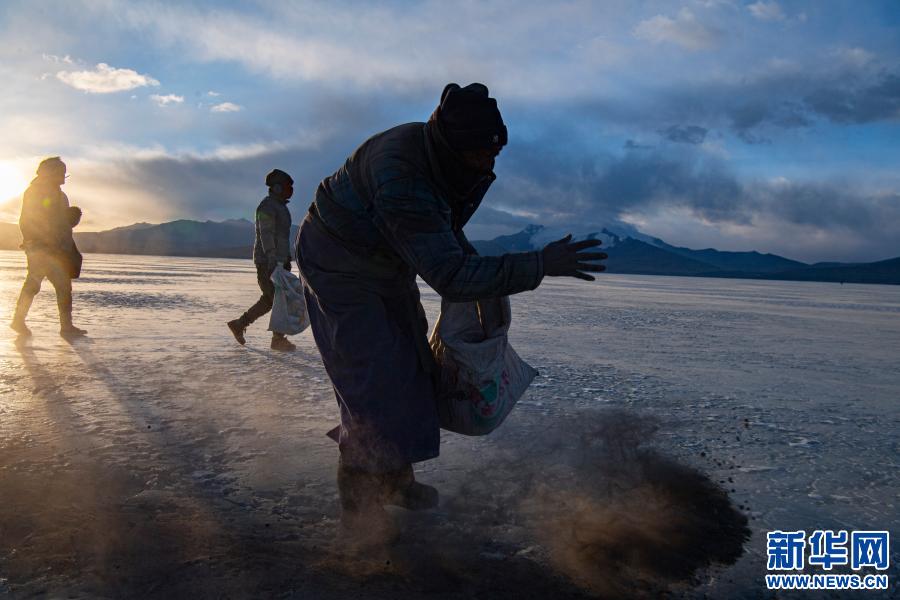 西藏山南市浪卡子縣堆瓦村的村民清晨背著牛糞爐灰來到普莫雍錯湖邊,準備修通安全小路(3月6日攝)。新華社記者 孫非 攝