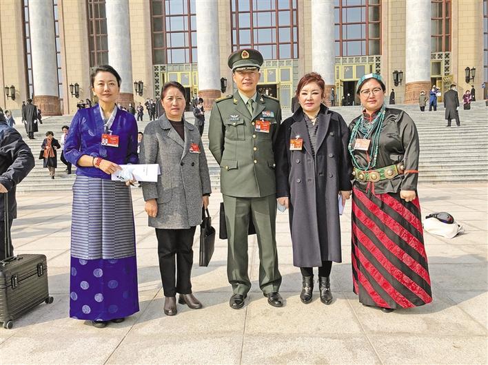 圖為住藏全國(guó)政協(xié)委員在會(huì)場(chǎng)外合影。記者 李洲 特約記者 旦增赤列 攝