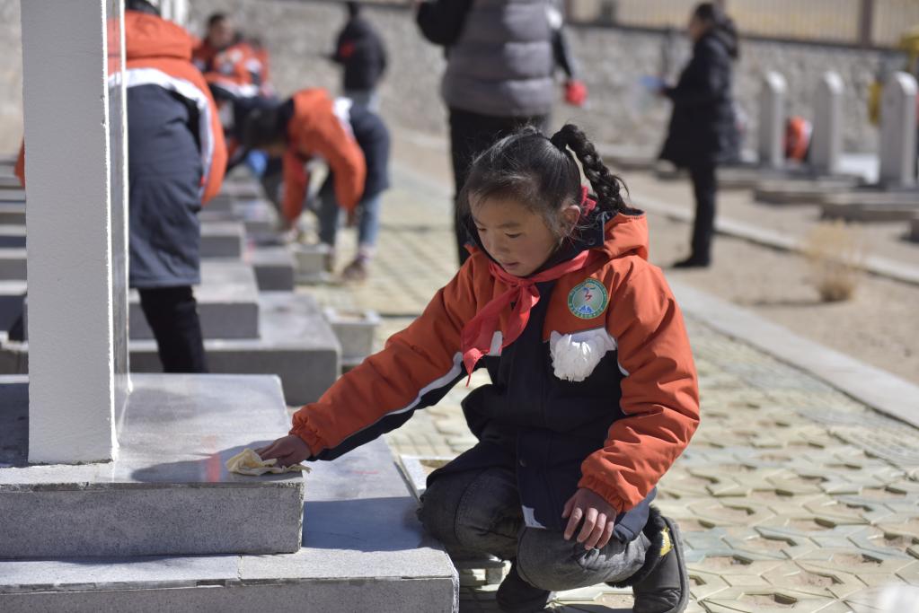 小學(xué)生細(xì)心擦拭著烈士的墓碑。(2021年4月4日 新華社記者翟永冠 攝)