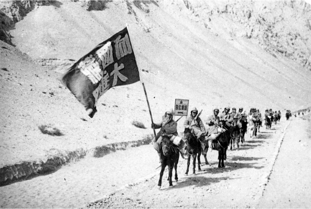 進(jìn)藏先遣連高舉紅旗向西藏阿里進(jìn)軍(執(zhí)旗者為先遣連副連長彭青云)。進(jìn)藏先遣連紀(jì)念館提供