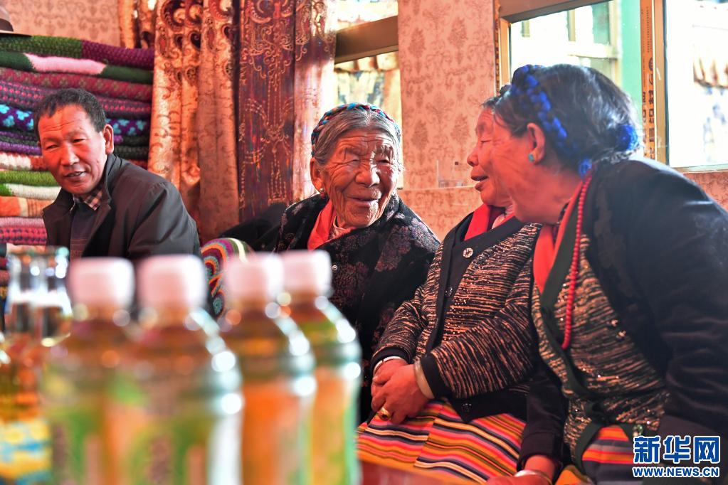 邊巴倉決(左二)和鄰居在家里拉家常(3月19日攝)。新華社記者 孫瑞博 攝