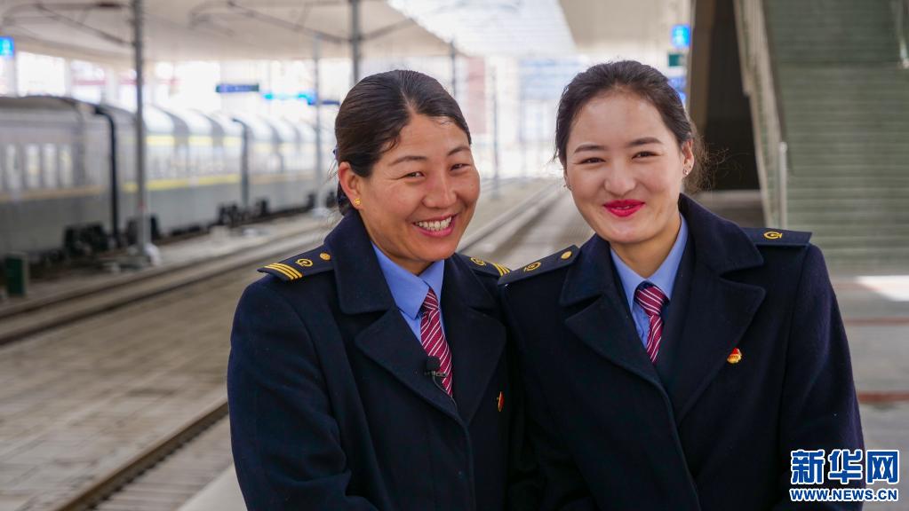 斯朗卓瑪(左)和同事在拉薩火車站合影(3月22日攝)。新華社記者 旦增尼瑪曲珠 攝
