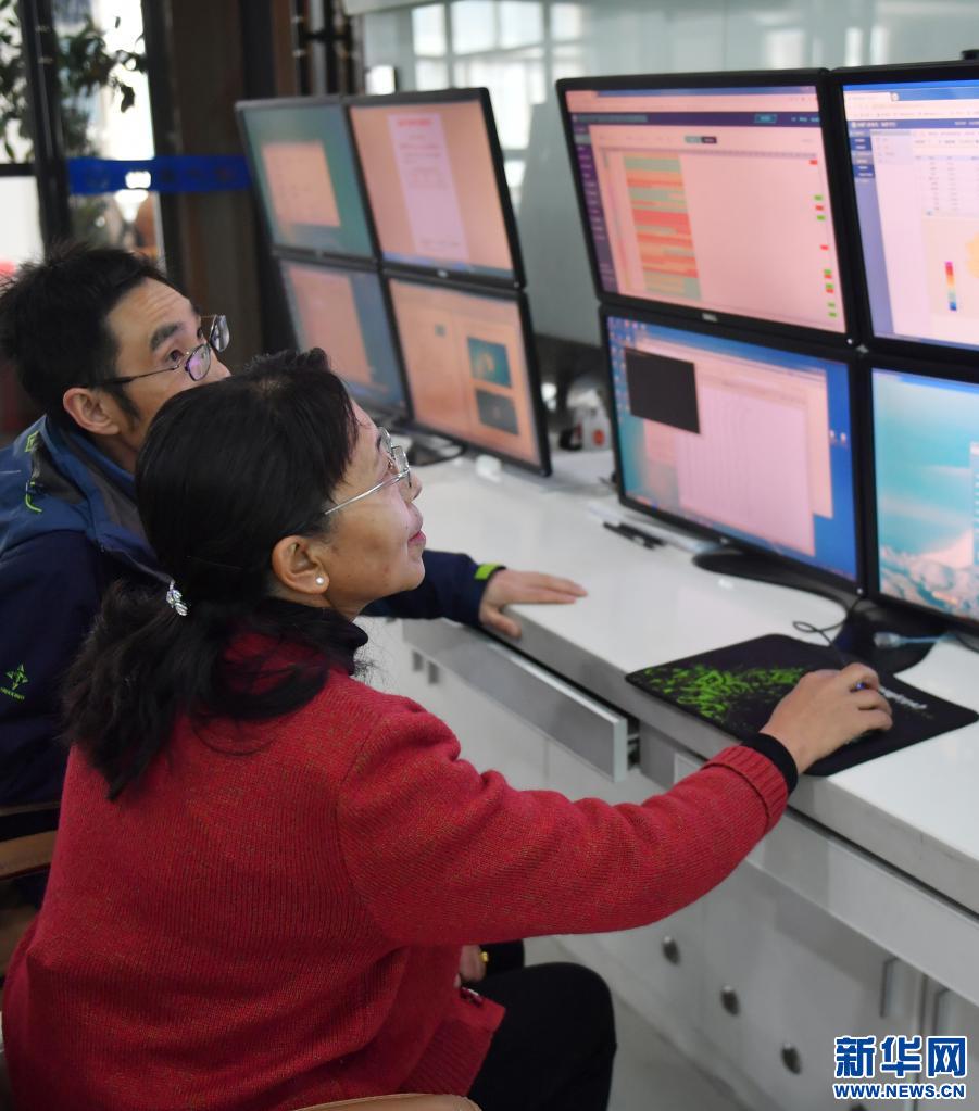 卓瑪(右)和同事在西藏自治區(qū)氣象局的辦公室討論氣象數(shù)據(jù)(3月12日攝)。新華社記者 孫瑞博 攝
