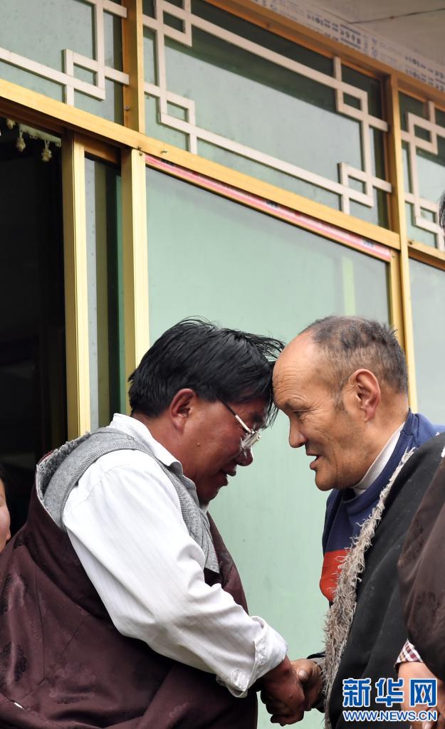 央多老人(右)在和看望他的村干部行碰頭禮(4月15日攝)。新華社記者 覺果 攝