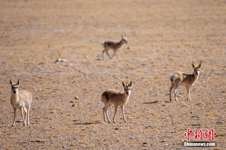“五一”小長假,中新網(wǎng)記者沿省干線公路自駕西藏自治區(qū)那曲羌塘草原腹地雙湖縣、申扎縣及班戈縣等地,看到當(dāng)?shù)夭亓缪?、藏野驢、藏原羚等成群覓食。羌塘草原平均海拔4500多米,對(duì)人類而言氣候條件惡劣,但動(dòng)物們卻將此作為“天堂”。圖為5月3日,西藏班戈縣草原上的4只藏原羚,當(dāng)?shù)啬撩穹Q為黃羊。江飛波 攝