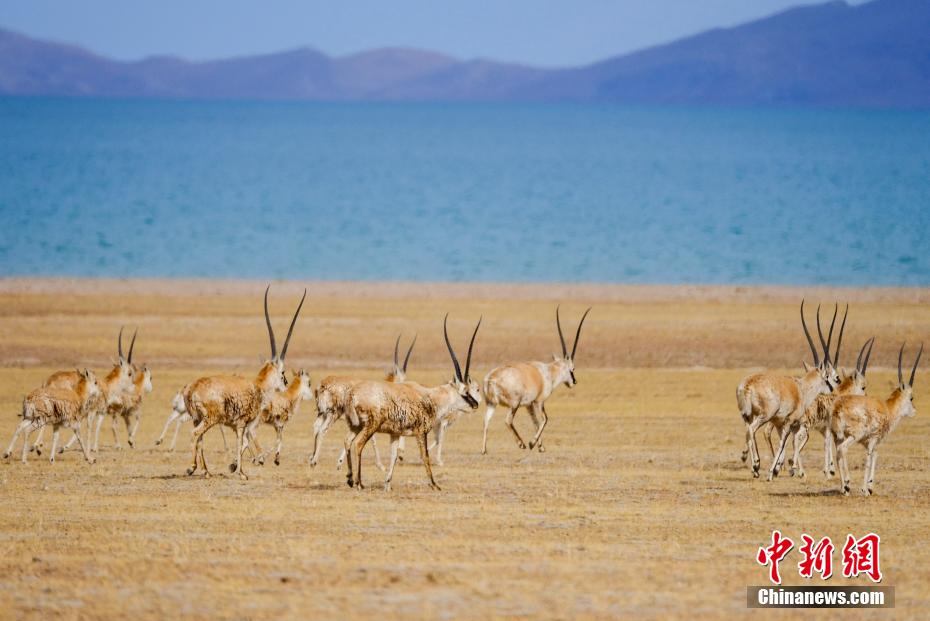 圖為5月2日,西藏那曲色林錯(cuò)湖邊的藏羚羊群。江飛波 攝