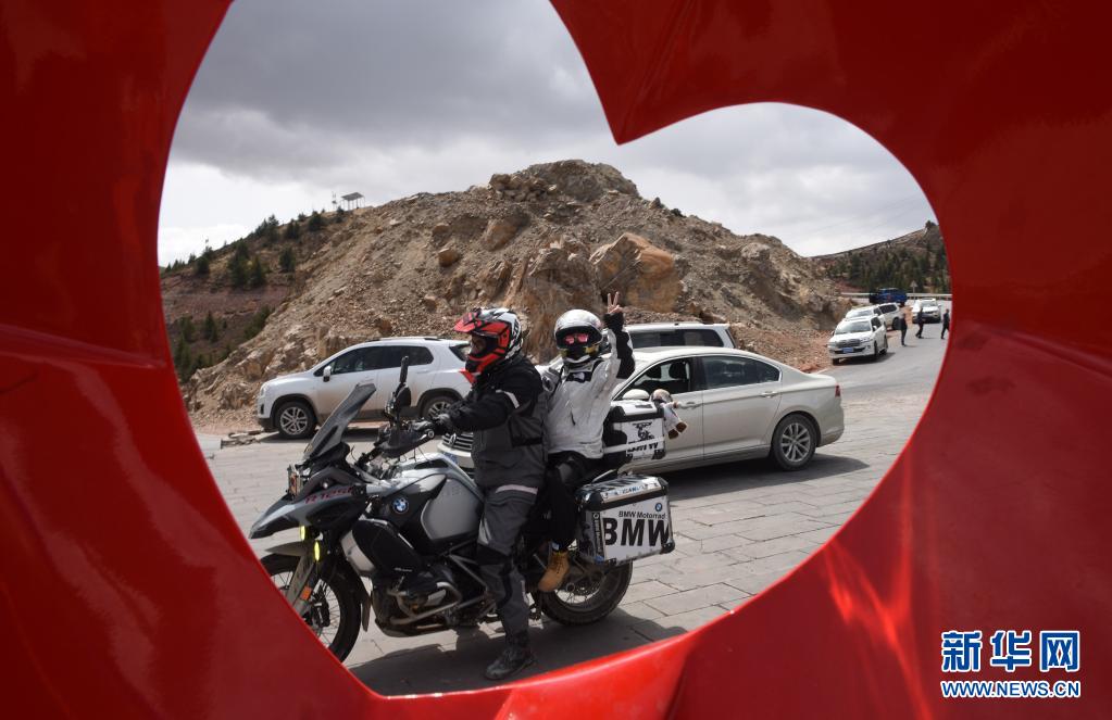 在西藏芒康縣拉烏山,騎行摩托的年輕人在一起合影(5月2日攝)。新華社記者 陳燮 攝