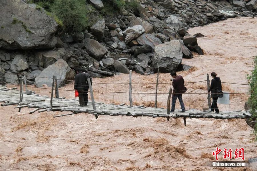 2014年,工作人員赴那曲比如縣進(jìn)行古籍普查,經(jīng)過怒江上一座簡易浮橋。受訪者供圖。