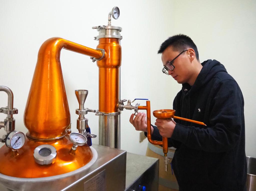 郭江正在調(diào)試釀酒的蒸餾設(shè)備。新華社記者 金一清 攝
