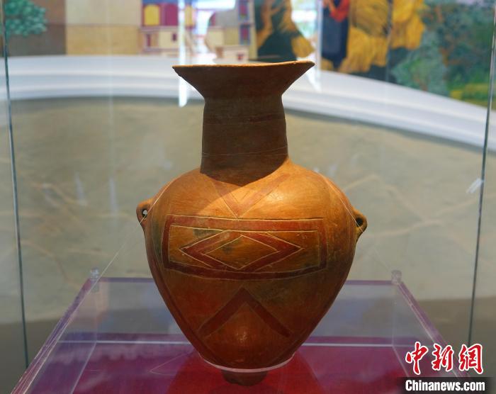 5月18日,山南市博物館展出的距今約2000年的雙耳尖底彩陶罐。冉文娟 攝