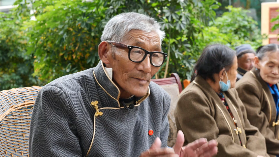 阿里地區(qū)老人護理院老人 拉松(藏語):護理員們經常給我們洗頭、洗澡、剪指甲,就像對待自己的親生父母一樣照顧我們,不嫌臟。好吃好喝都有,平時還可以跟其他老人一起玩玩骰子、打打撲克,很開心、很快樂,這都是國家的恩惠。