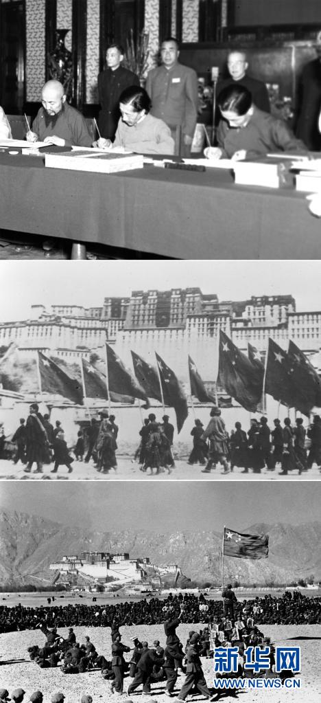 這是一張拼版照片:上圖為1951年5月23日,中央人民政府與西藏地方政府在北京簽訂《關于和平解放西藏辦法的協(xié)議》(簡稱“十七條協(xié)議”)。上圖為西藏地方政府代表在協(xié)議上簽字;中圖為1951年10月26日,西藏地方政府為人民解放軍舉行了隆重的入城式,拉薩古城飄揚著五星紅旗;下圖為西藏和平解放后,人民解放軍與藏族群眾在布達拉宮前歡度新年。