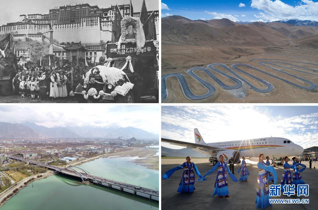 這是一張拼版照片:左上圖為1954年12月25日,康藏(今川藏)、青藏兩條公路通車儀式在布達拉宮前舉行(資料照片);左下圖為橫跨在拉薩河上的拉薩市區(qū)公路(2019年4月3日新華社記者晉美多吉攝,無人機照片);右上圖為通往珠峰的公路(2017年5月19日新華社記者 普布扎西攝);右下圖為西藏航空有限公司成立并舉行首航儀式(2011年7月26日新華社記者覺果攝)。新華社發(fā)