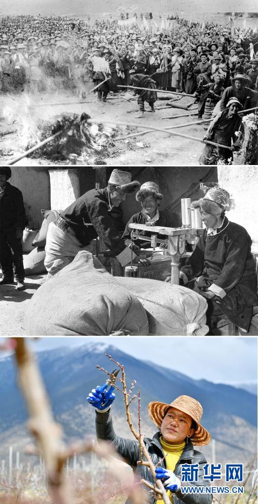 這是一張拼版照片:上圖為1959年8月,西藏墨竹工卡縣的翻身農奴焚燒三大領主的剝削文契(新華社發(fā));中圖為1984年,江孜縣農民洛桑旺堆(左)向國家出售余糧。他家承包土地100多畝,農忙種地,農閑搞建筑、跑運輸(新華社記者土登攝);下圖為2020年3月22日,西藏林芝現(xiàn)代蘋果標準化示范園的工作人員為桃樹剪枝。該示范園實施農機農藝結合、水肥一體化及“果草畜循環(huán)”,大面積推廣蘋果矮砧集約高效栽培技術,帶動米林縣羌納鄉(xiāng)林巴、才巴、色沃村及附近的農戶增收(新華社記者 張汝鋒 攝)。新華社發(fā)
