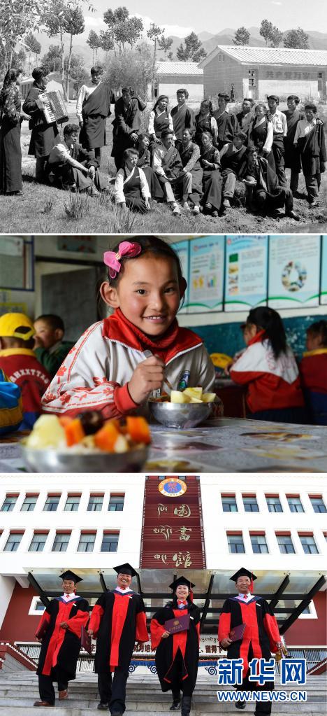 這是一張拼版照片:上圖為拉薩中學的應屆畢業(yè)生在校園里練歌,準備參加畢業(yè)典禮(新華社記者任用昭攝);中圖為一名藏族女孩在西藏雙湖縣嘎措鄉(xiāng)小學內享受“三包”(包吃、包住、包學習費用)政策(2014年6月29日新華社記者普布扎西攝);下圖為2017年11月10日,西藏大學舉行首屆博士研究生畢業(yè)典禮,向4名畢業(yè)生授予博士學位。這4名博士分別來自藏族歷史專業(yè)、藏語言文學專業(yè)及高原醫(yī)學專業(yè)(新華社記者覺果攝)。新華社發(fā)