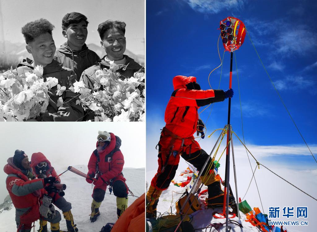 這是一張拼版照片:左上圖為1960年5月登上珠穆朗瑪峰頂?shù)闹袊巧疥犼爢T王富洲(右)、貢布(中)和屈銀華(資料照片 新華社發(fā));左下圖為2008年5月8日,北京奧運圣火珠峰傳遞登山隊隊員羅布占堆(左)點燃第一棒火炬手吉吉手中的“祥云”火炬(新華社發(fā));右圖為2020珠峰高程測量登山隊隊員在珠穆朗瑪峰峰頂開展測量工作(2020年5月27日新華社特約記者扎西次仁攝)。新華社發(fā)