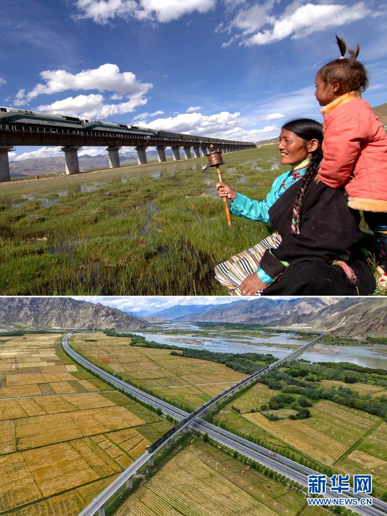 這是一張拼版照片:上圖為西藏當雄縣藏族群眾在觀看火車駛過(2006年6月17日 新華社記者覺果攝);下圖為在西藏拉薩市曲水縣拍攝的公路與鐵路(2016年8月17日新華社記者普布扎西攝 無人機照片),西藏已形成了公路、鐵路、航空的立體交通網(wǎng)絡。新華社發(fā)